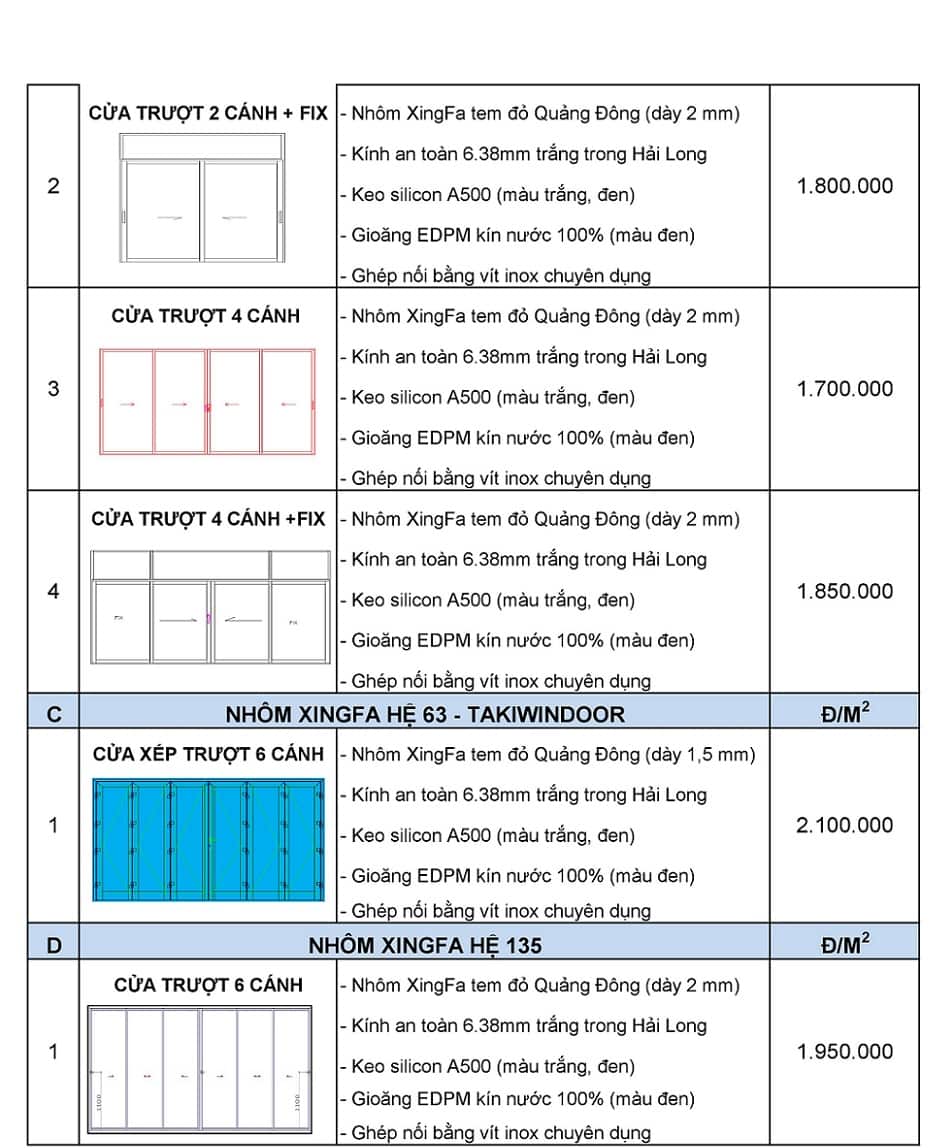 | 5 | CỬA ĐI 4 CÁNH MỞ QUAY + FIX | Nhôm hệ 55 dày 2mm. Kích thước cửa 2800x2800 + Kính 6.38mm | 2.150.000 |