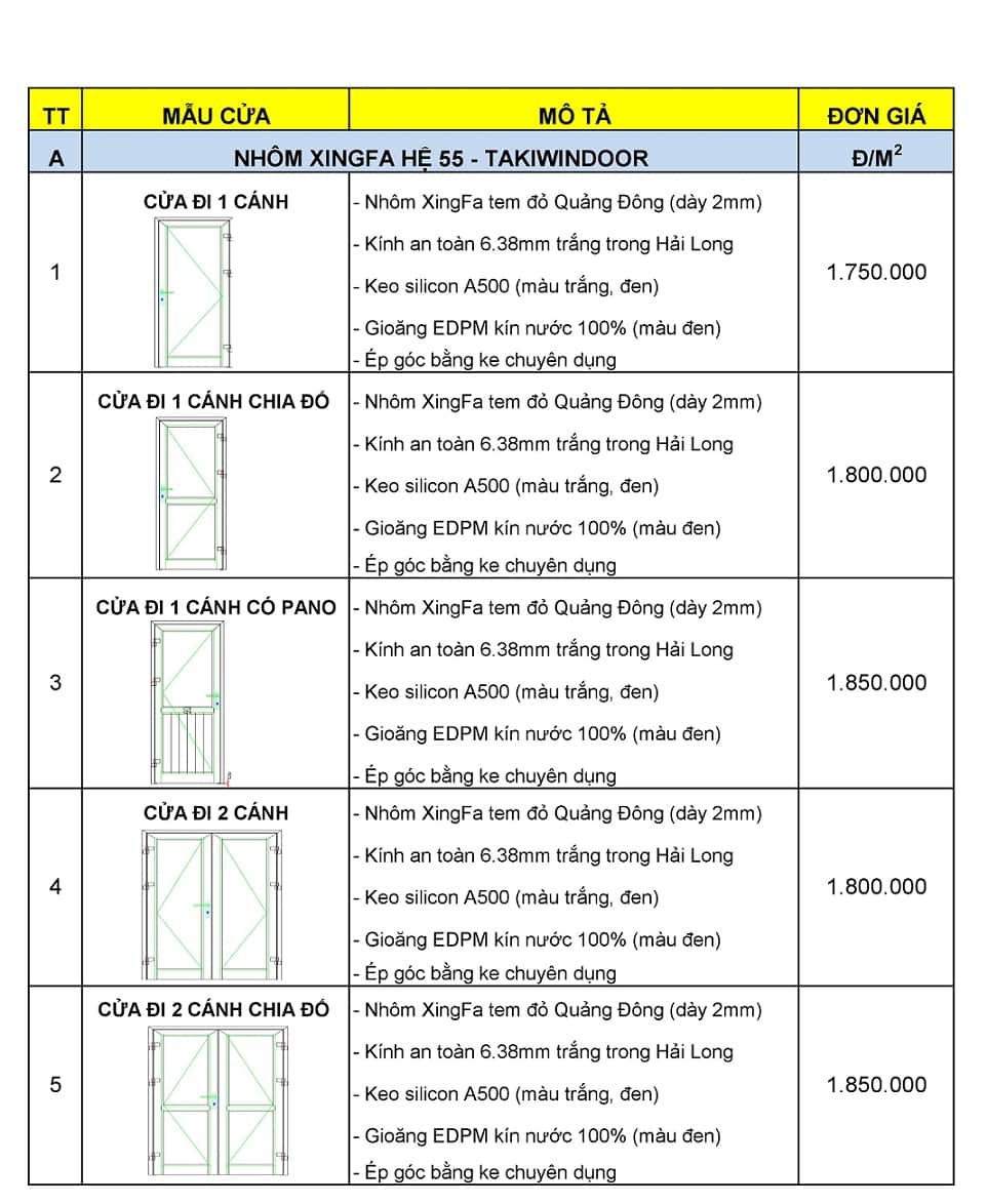 | 1 | CỬA ĐI 1 CÁNH MỞ QUAY | Nhôm hệ 55 dày 2mm. Kích thước cửa 900x2200 + Kính 6.38mm | 2.150.000 |