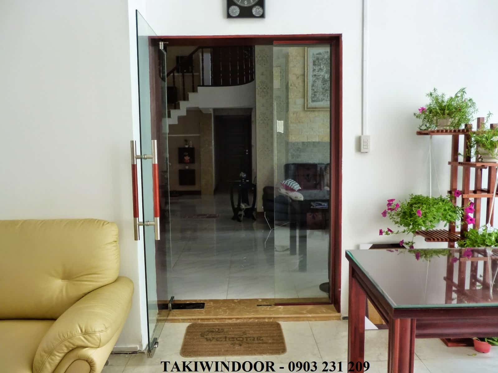 Cửa thủy lực mở quay 1 cánh lắp trong khuôn gỗ (chúng tôi sử dụng nẹp sập kính vân gỗ và tay nắm màu gỗ tạo thẩm mỹ cho bộ cửa)